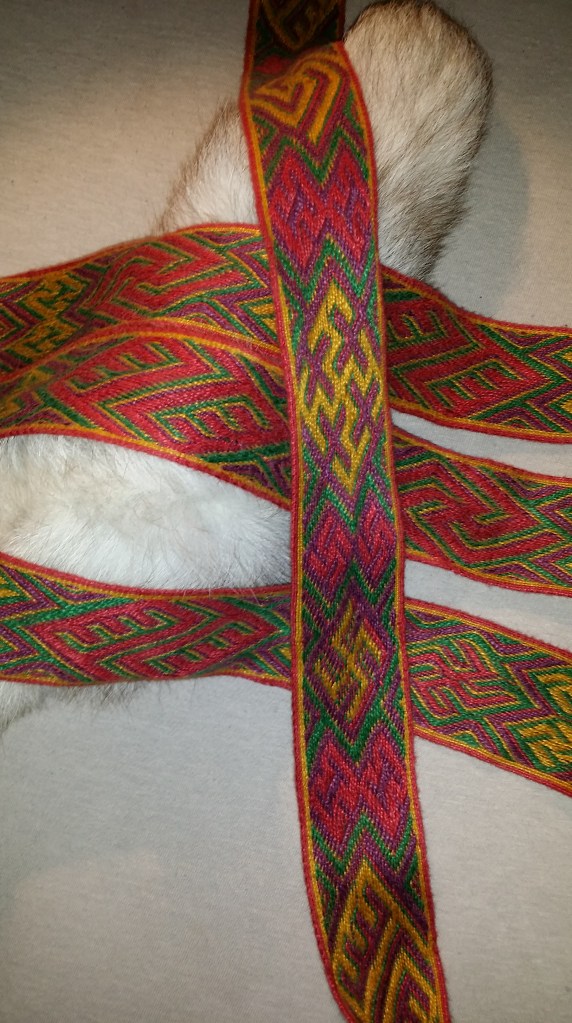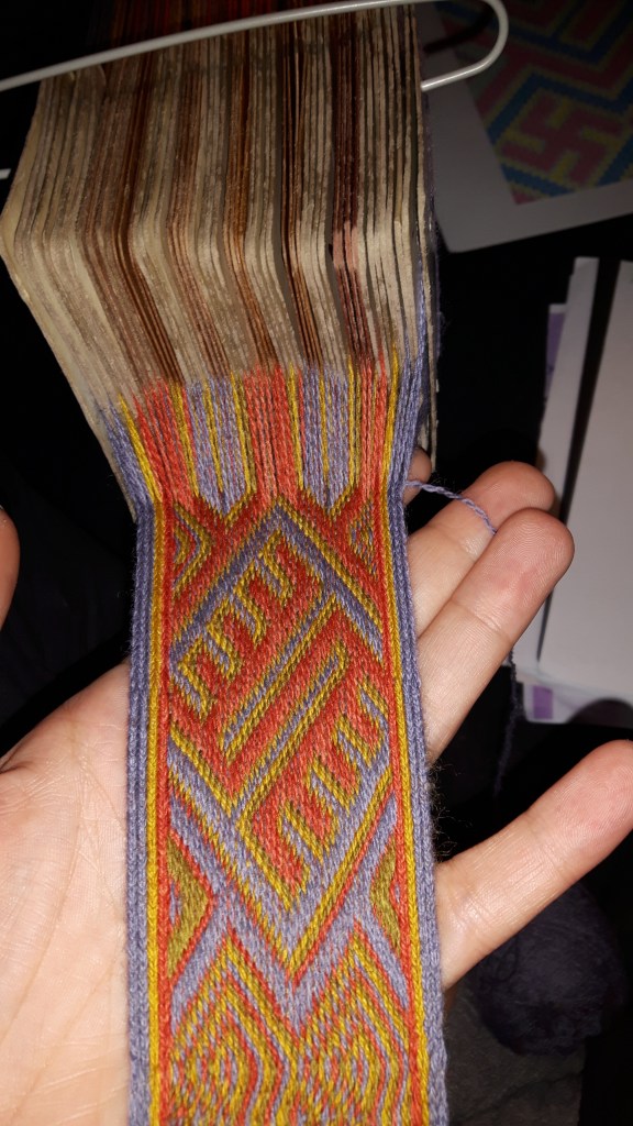 The original tablet woven band consists of 4 fragments, in total 35 cm long and 5 cm wide. It takes 56 tablets to weave it. It is woven with thin plant-dyed wool. The original tablet woven band has figures which are almost perfectly square. The perfectionist in me wishes my figures were just a liiiittle bit more square!